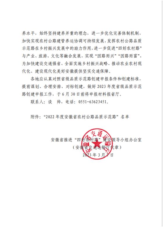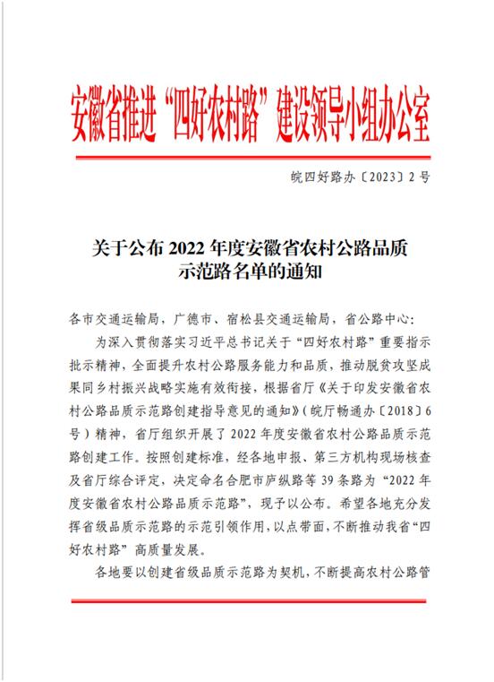 近日,2022年度安徽省农村公路品质示范路名单正式公布,由合肥路桥承建的2021年界首市陶司路及自然村通硬化路和联网路工程中的陶司路(原名伍陶路)榜上有名。