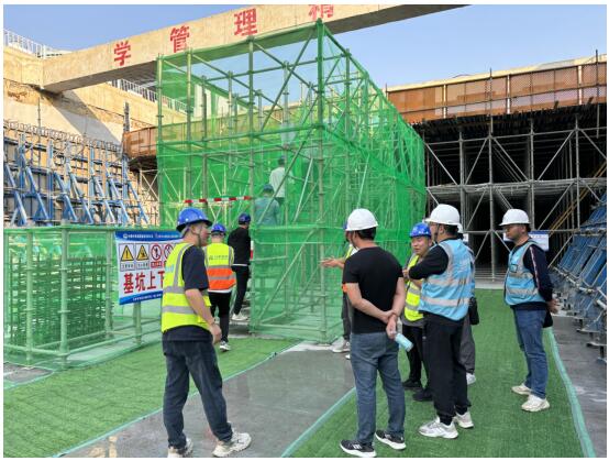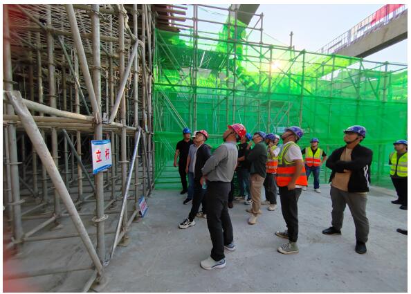 在龙岗路站建设现场,观摩人员听取了有关项目工程概况、施工工艺、盘扣架搭设参数及过程管控等情况介绍,实地参观了项目主体结构第四仓段(9-11轴)负一层顶板主体模板支架,详细了解了盘扣支架搭设工艺流程。
