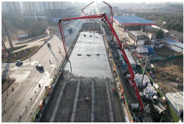 2024年1月8上午,G312合六路快速化改造工程上跨桥迎宾大道第三联顶板混凝土浇筑完成,至此迎宾大道上跨桥右半幅顺利贯通。