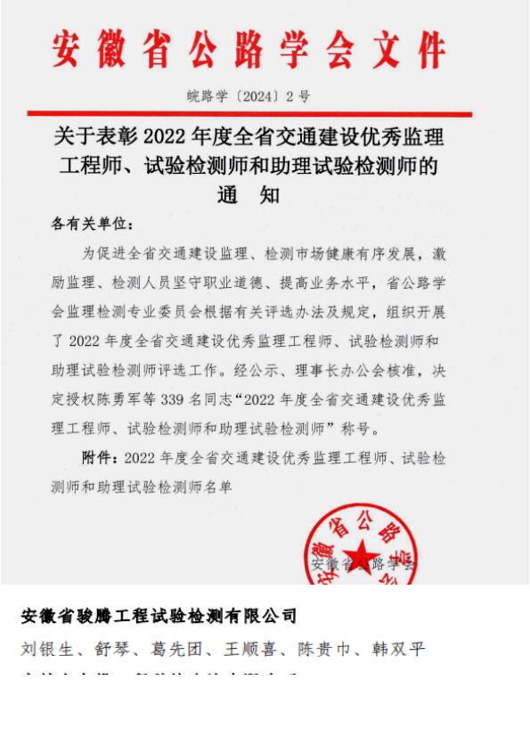 日前,从安徽省公路学会获悉,2022年度全省优秀检测师、优秀助理检测师评选结果出炉,骏腾检测刘银生、舒琴、葛先团、王顺喜、陈贵巾、韩双平等同志荣获称号。