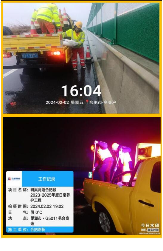 2日下午,合肥路桥S104养护项目部紧急召开会议,启动除雪保畅应急预案。明确分工、责任到人后,项目部提前展开部署,对S104撮镇大桥和公跨铁大桥撒布融雪剂展开防冻作业,项目应急巡查24小时轮岗作业,应急机械、人员24小时待命。